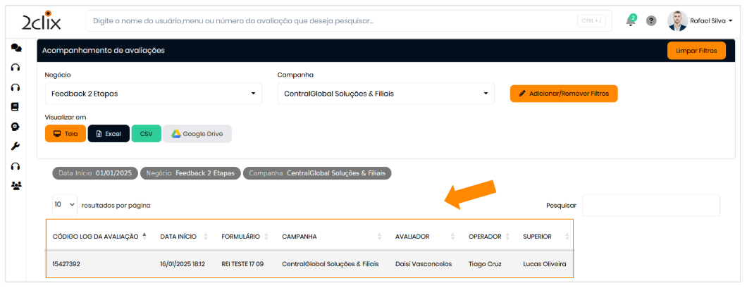 - Caso uma avaliação esteja em andamento, os detalhes serão exibidos na tela conforme os filtros aplicados.