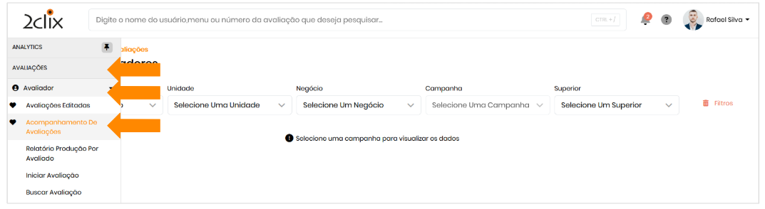 - No menu lateral esquerdo, clique em Avaliações > Avaliador > Acompanhamento de Avaliações .