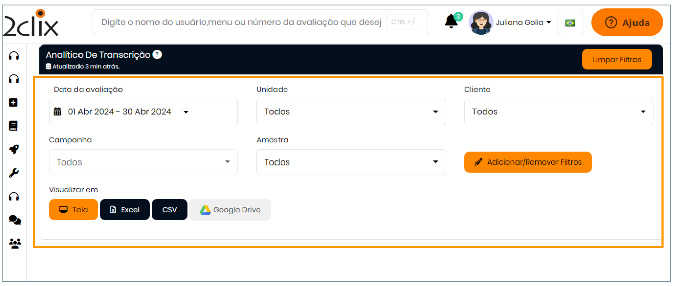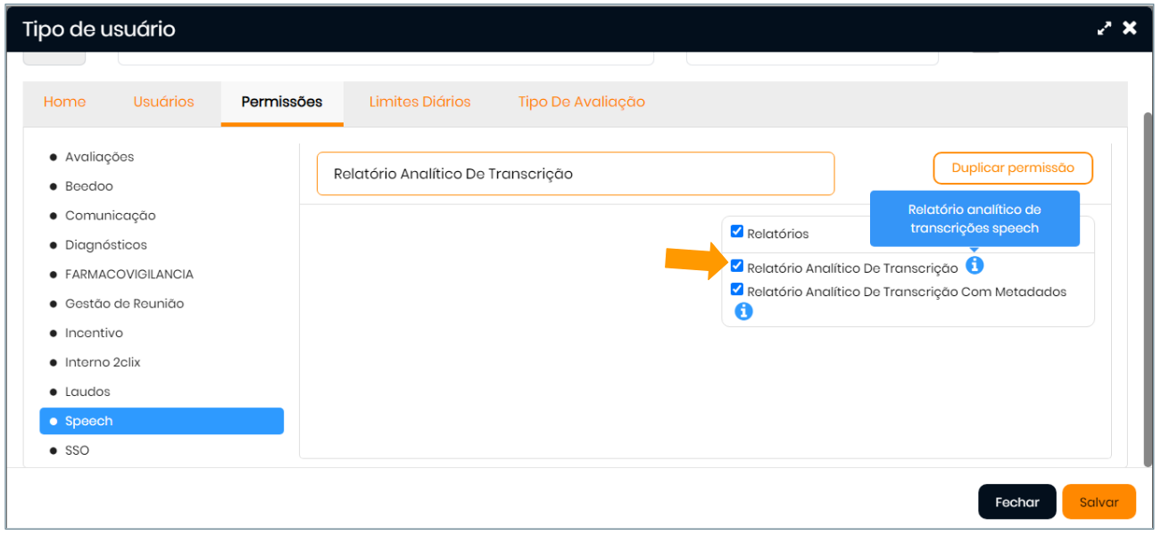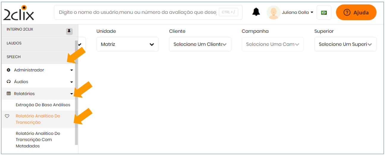 1°: Para acessar, clique em: Speech>Relatórios>Relatório Analitico de Transcrição.
