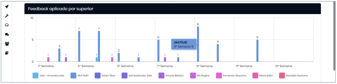 A quantidade de feedbacks tratados por superior ao longo das semanas.