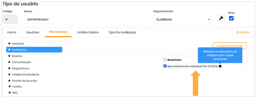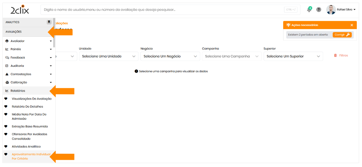 No menu lateral esquerdo, acesse: Avaliações > Relatórios > Aproveitamento Individual por Critério