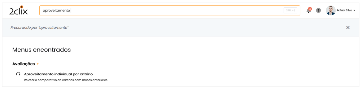 - Digite "Aproveitamento Individual por Critério" e selecione o resultado correspondente para ser direcionado diretamente ao relatório.