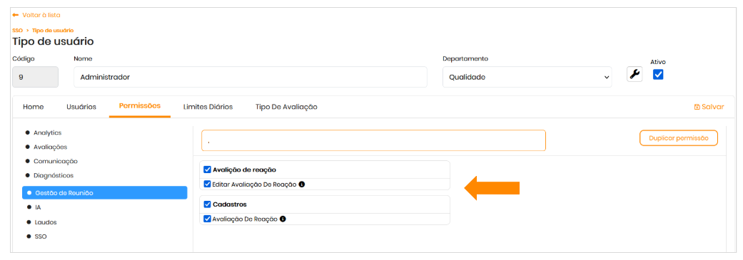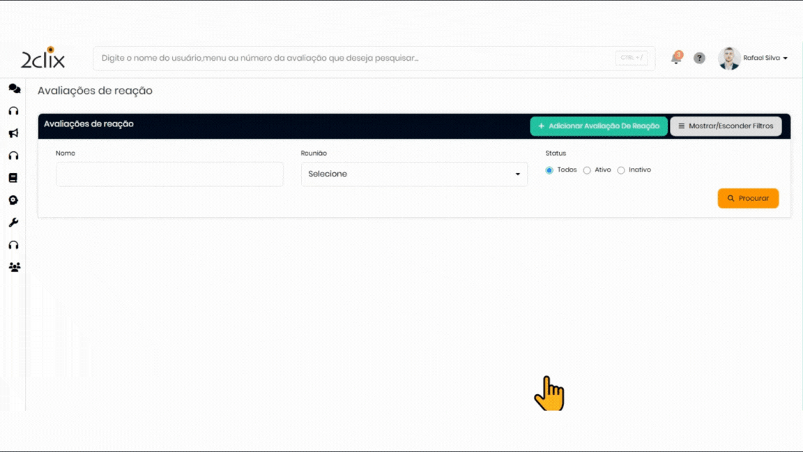 No menu lateral esquerdo, acesse: Gestão de Reunião > Cadastro > Avaliação de Reação.