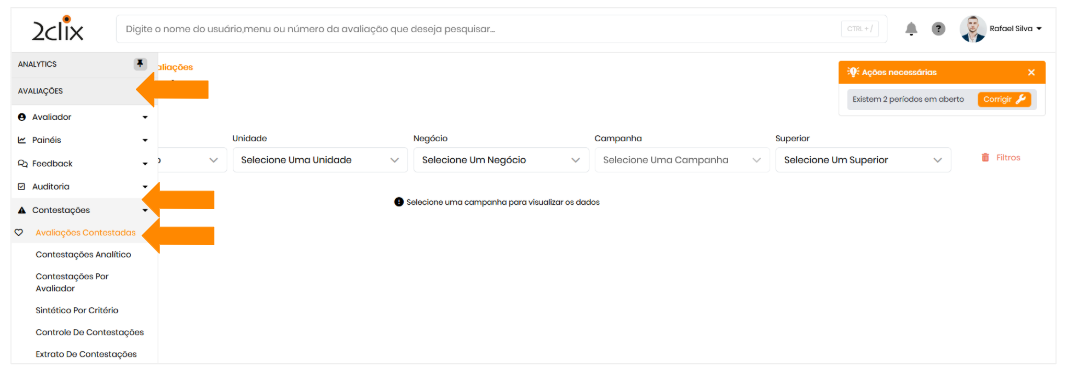 - No menu lateral esquerdo, acesse: Avaliações > Contestações > Avaliações Contestadas.