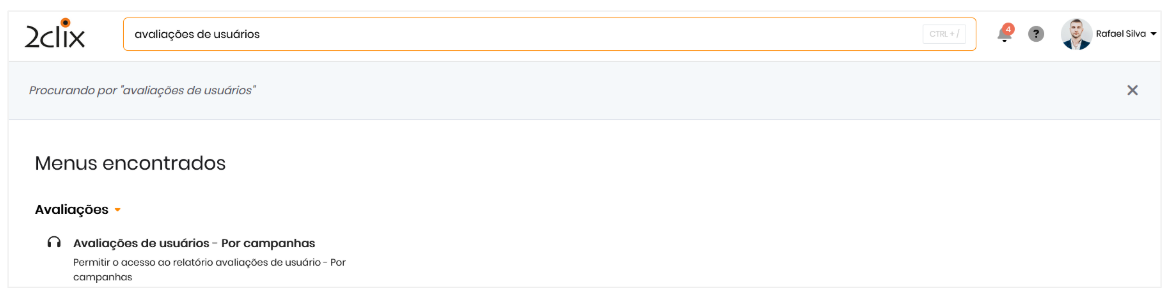- Digite "Avaliações de Usuários - Por Campanha" e selecione o resultado correspondente para ser direcionado diretamente ao relatório.