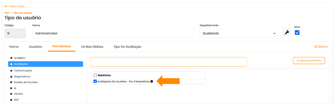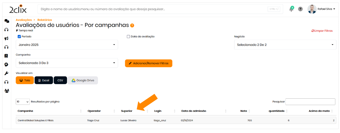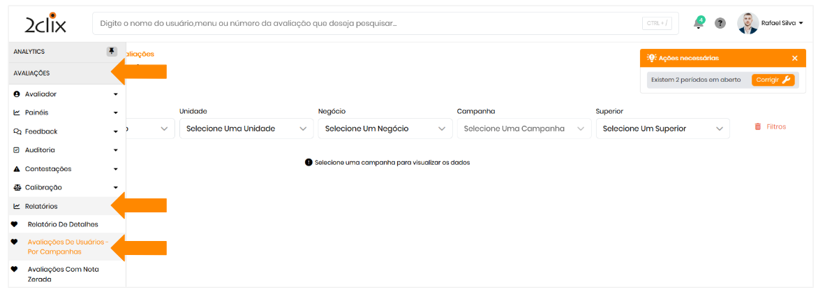 - No menu lateral esquerdo, acesse: Avaliações > Relatórios >Avaliações de Usuários - Por Campanha.