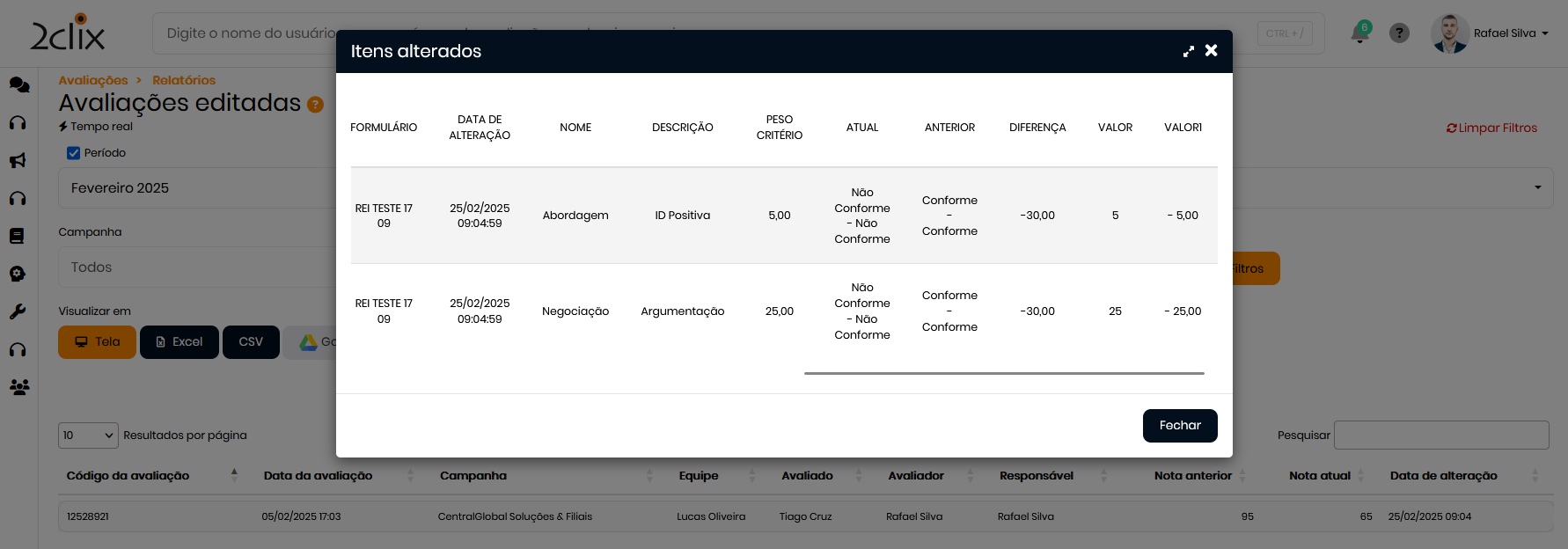 - Todas as edições feitas em qualquer item da avaliação serão registradas neste relatório.