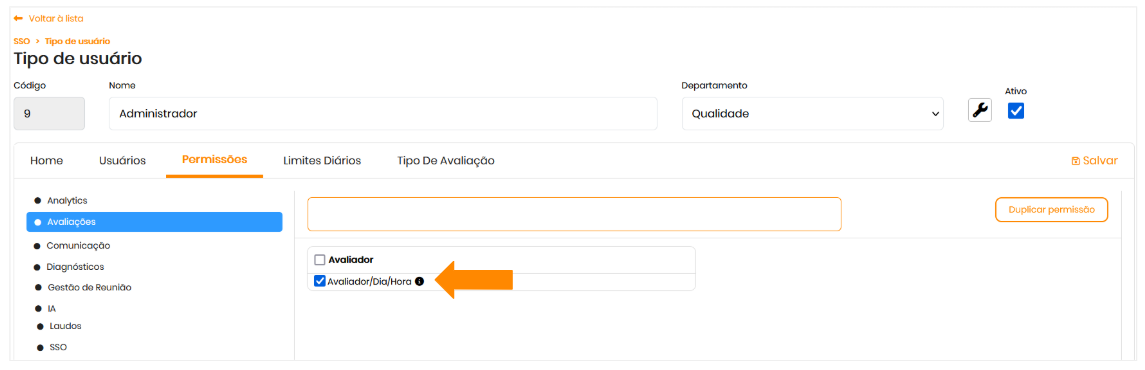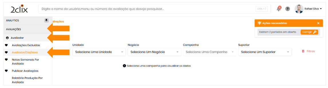 No menu lateral esquerdo, acesse: Avaliações > Avaliador > Avaliador/Dia/Hora