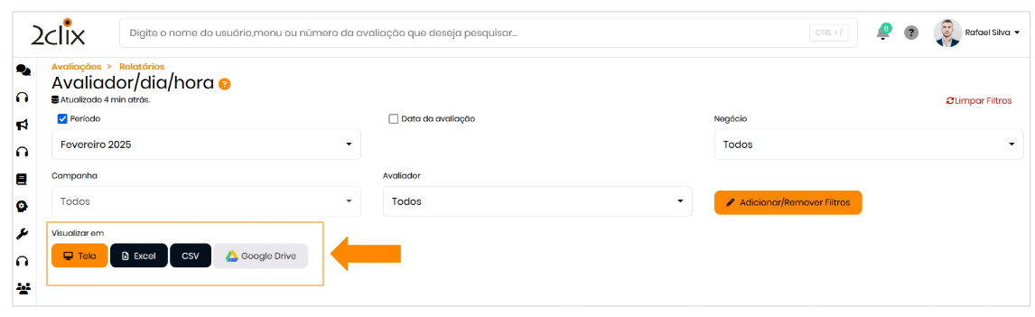 Escolha o formato de exportação: Tela, Excel, CSV ou Google Drive.
