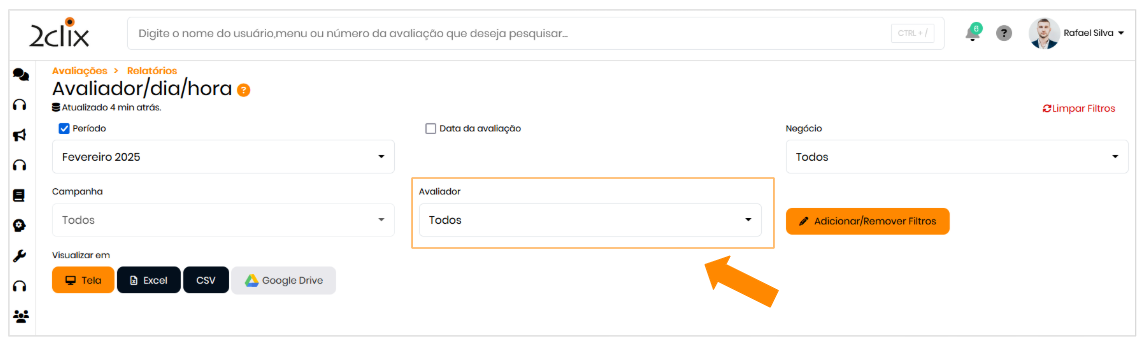 O nome do avaliador não aparece no relatório porque ele já foi escolhido no filtro.