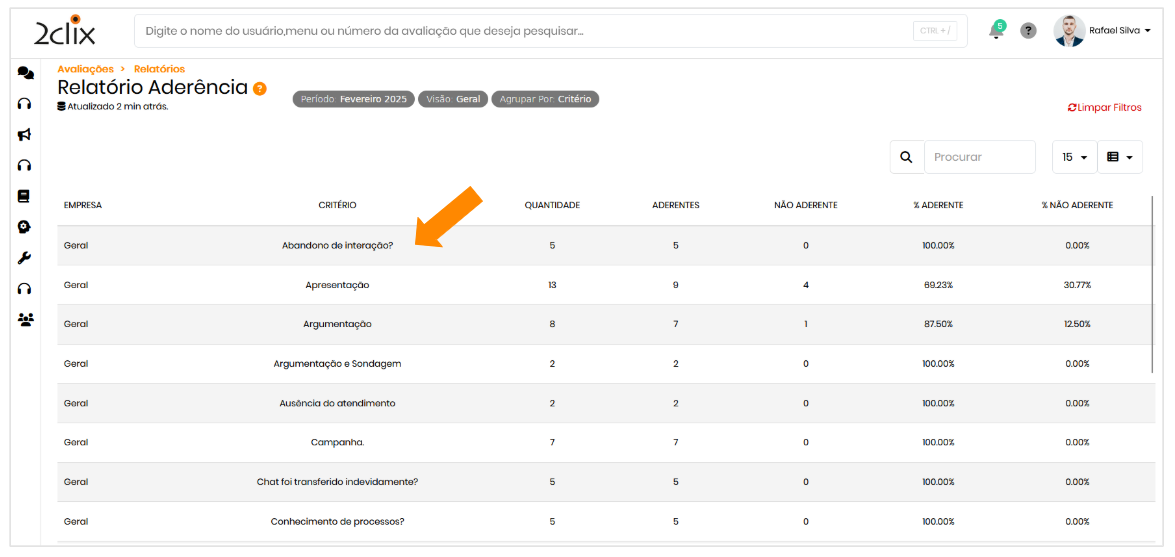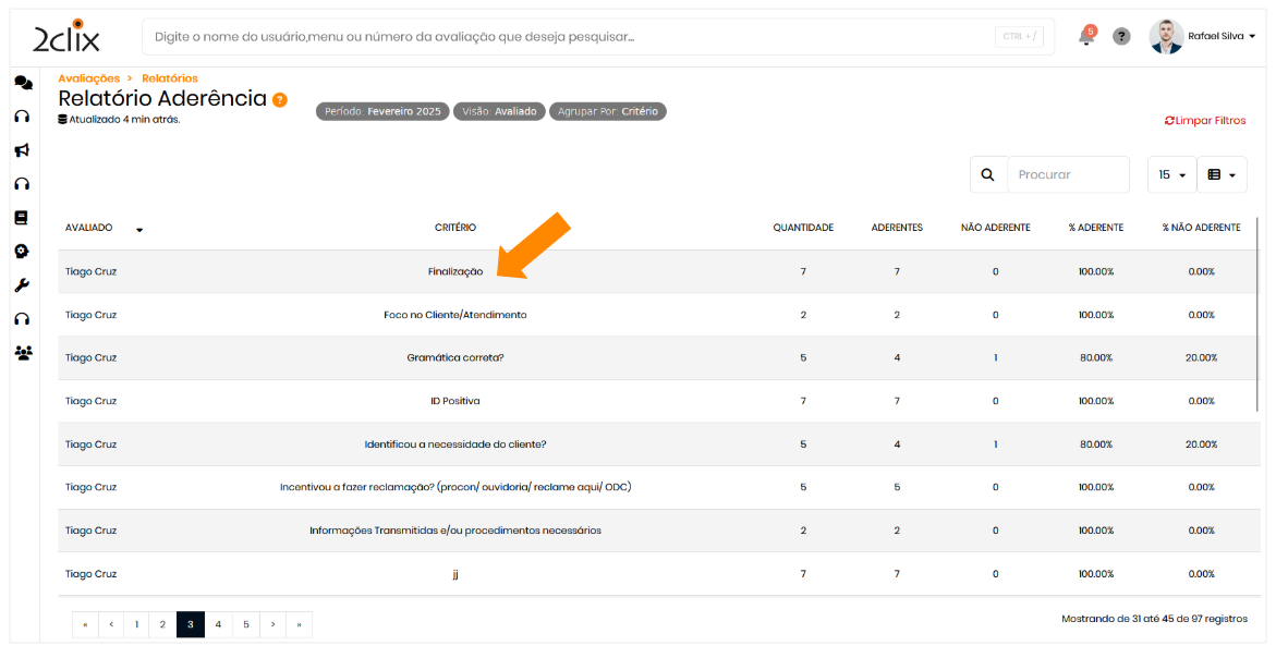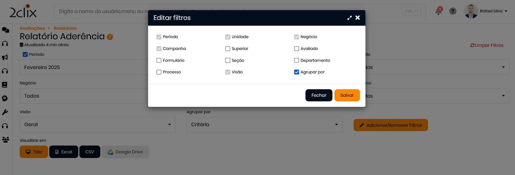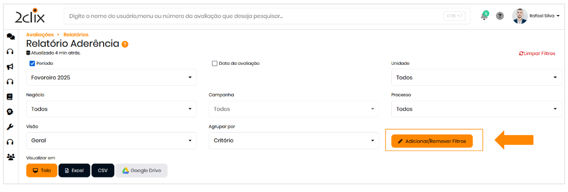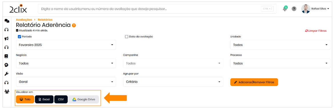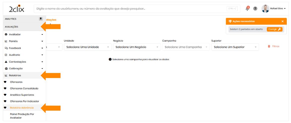 - No menu lateral esquerdo, acesse: Avaliações > Relatórios > Relatório de Aderência.