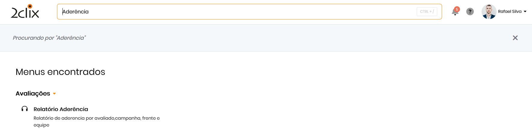 - Digite "Relatório de Aderência" e selecione o resultado correspondente para ser direcionado diretamente ao relatório.