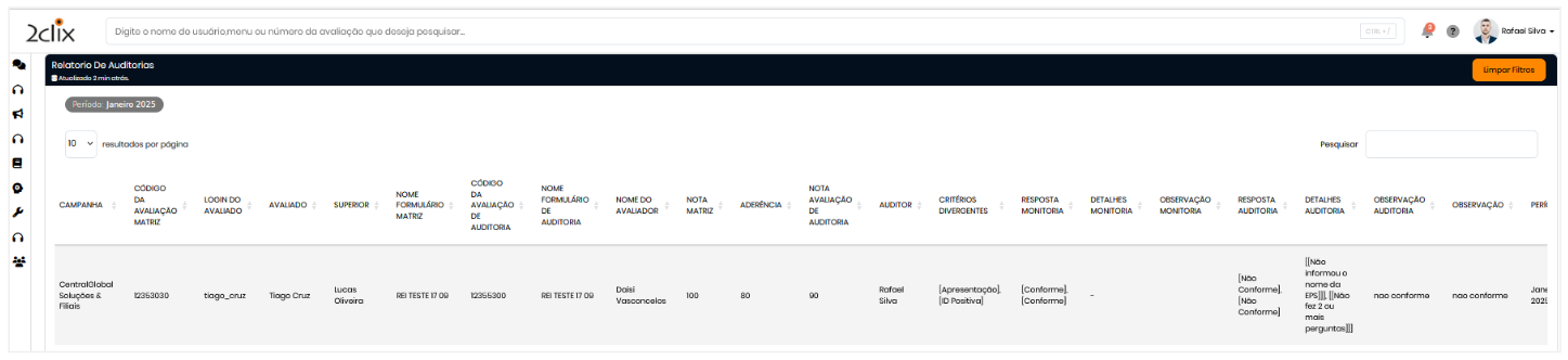 O Relatório de Auditoria oferece uma visão analítica e detalhada sobre os auditorias realizadas, permitindo comparar notas entre avaliações matrizes e auditorias, identificar discrepâncias e avaliar a precisão do avaliado aos critérios estabelecidos.