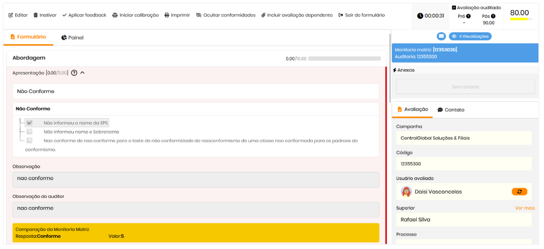 - No formulário, é possível analisar os itens, avaliar a conformidade e aplicar feedbacks diretamente, garantindo integração eficiente entre os processos de avaliação e auditorias.