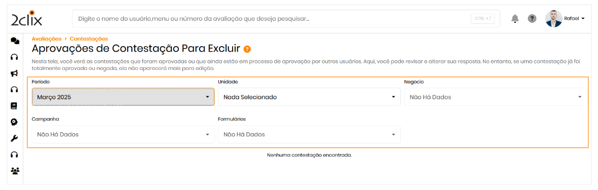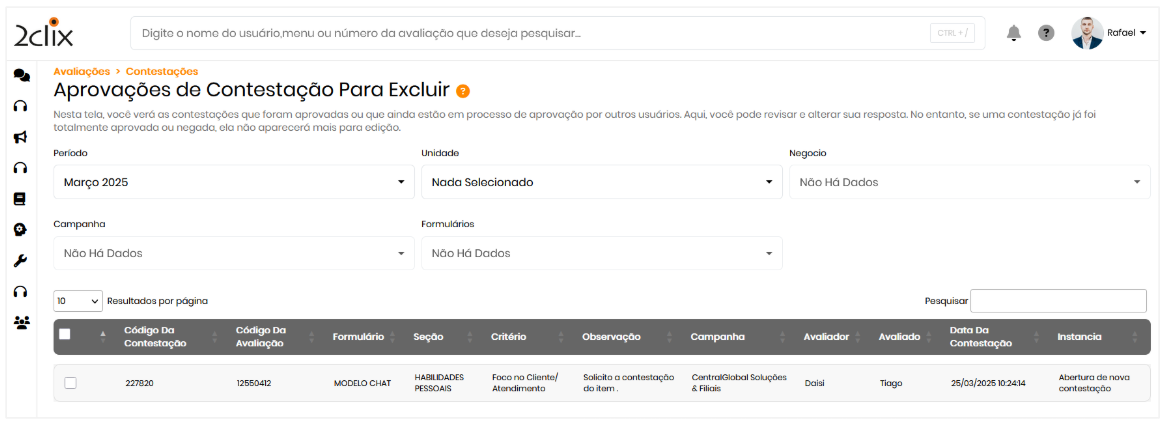 Ao acessar a funcionalidade de exclusão de aprovações de contestação, você visualizará as contestações que foram aprovadas ou que ainda estão em processo de aprovação por outros usuários. Essa tela permite revisar e, se necessário, alterar sua resposta. No entanto, caso uma contestação já tenha sido totalmente aprovada ou negada, ela não estará mais disponível para edição.
