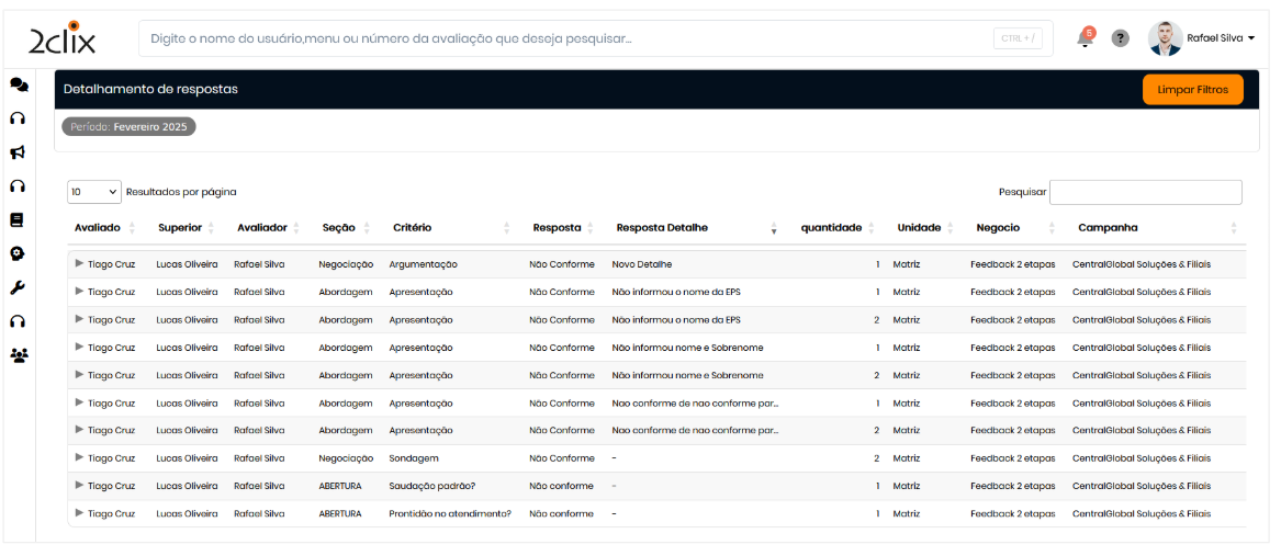 O relatório de Detalhamento de Respostas permite analisar as respostas dadas em cada critério, organizadas por avaliado. Essa funcionalidade é essencial para um estudo mais aprofundado sobre os itens avaliados, ajudando a identificar pontos críticos. Se no Cadastro de Formulários foram definidos detalhes para as opções de resposta, este relatório possibilitará uma analise mais precisa.