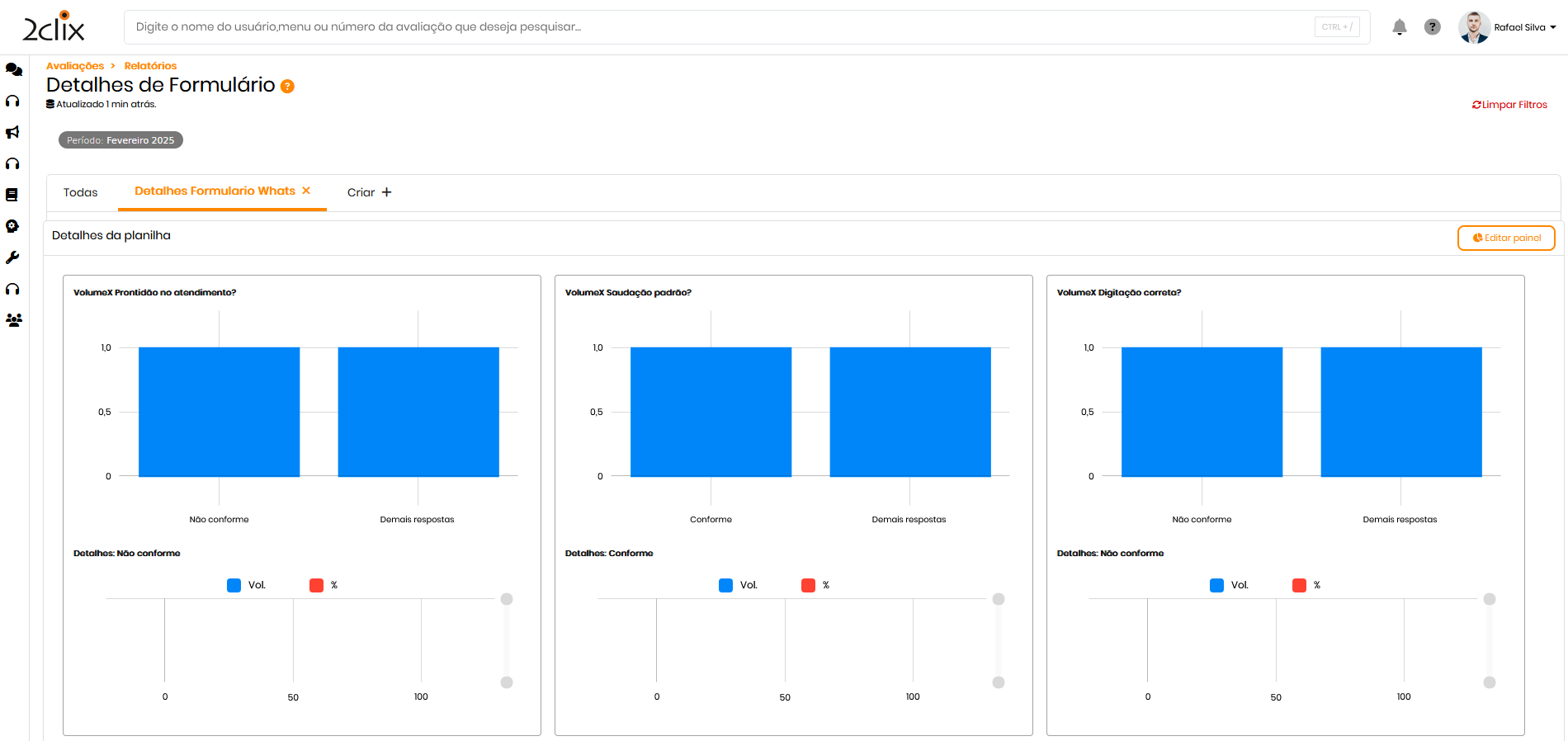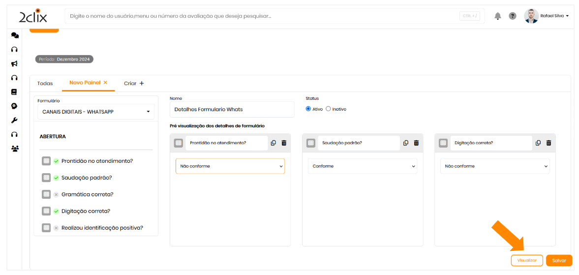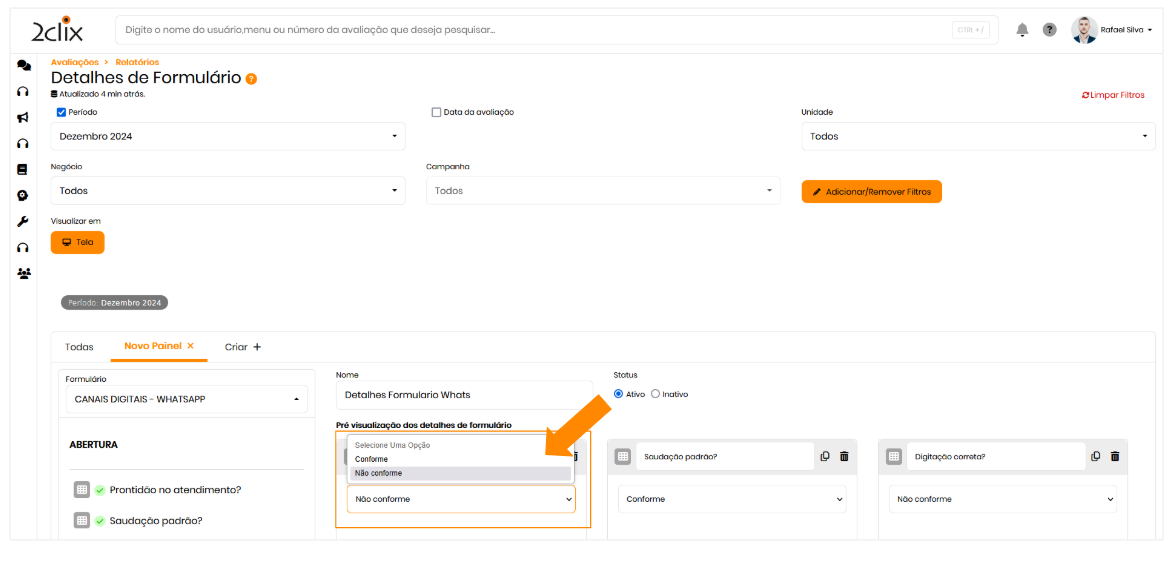 A funcionalidade Detalhes de Formulários permite visualizar e analisar as respostas dos formulários de maneira detalhada. Com essa ferramenta, você pode escolher quais critérios (perguntas) serão exibidas nos gráficos e definir quais respostas serão representadas em cada painel.