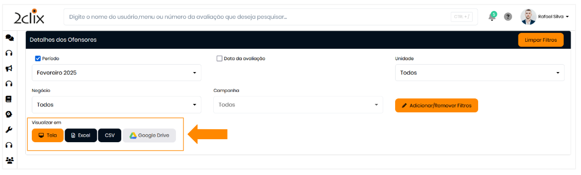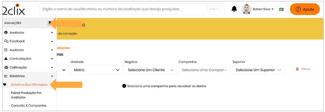 - No menu lateral esquerdo, acesse: Avaliações > Relatórios > Detalhes dos Ofensores