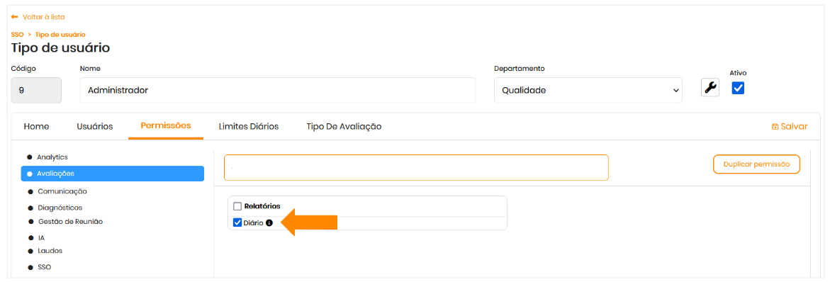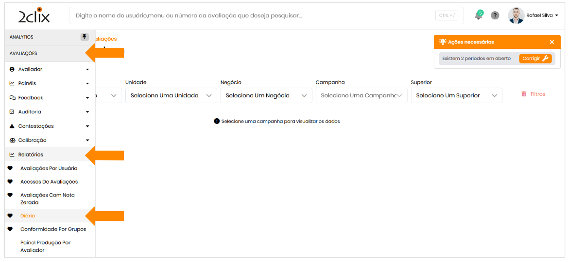 - No menu lateral esquerdo, acesse: Avaliações > Relatórios > Diário.
