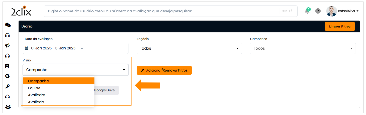 Para tornar a análise mais eficiente, o relatório Diário oferece diferentes filtros que permitem personalizar as informações exibidas. No filtro de visão você pode filtrar os dados por: