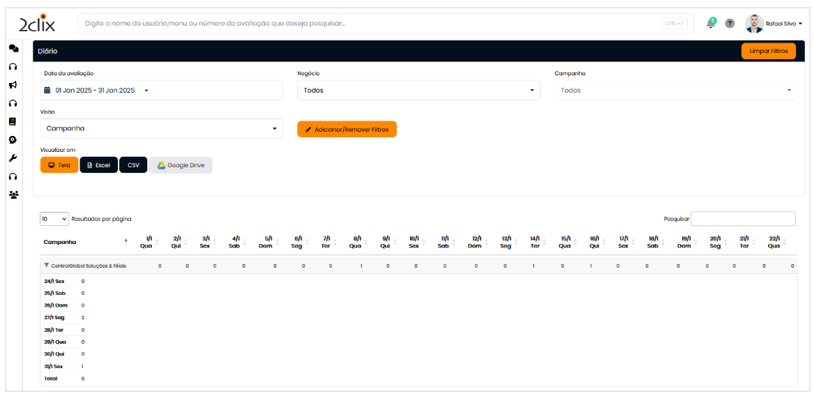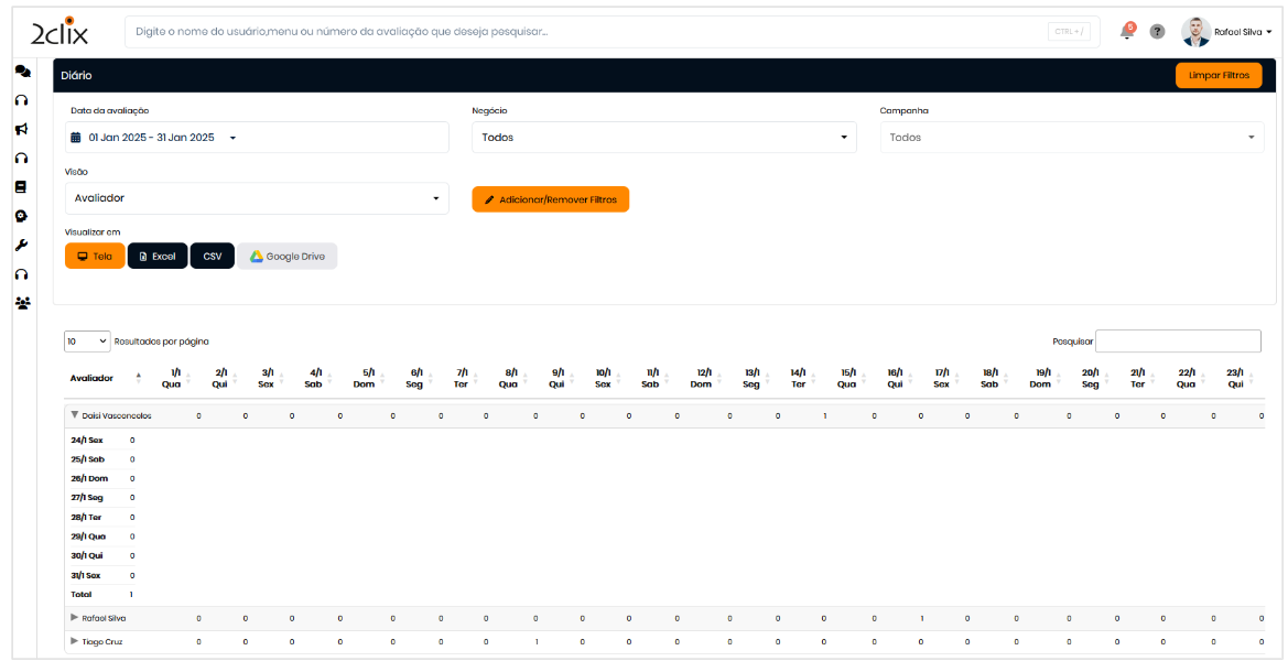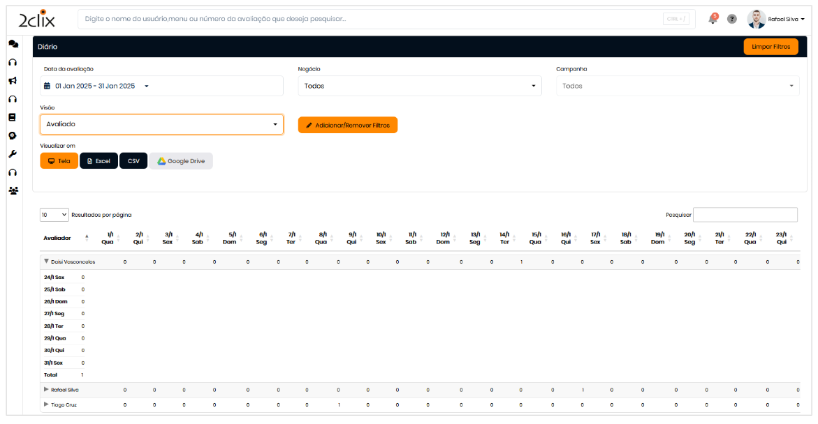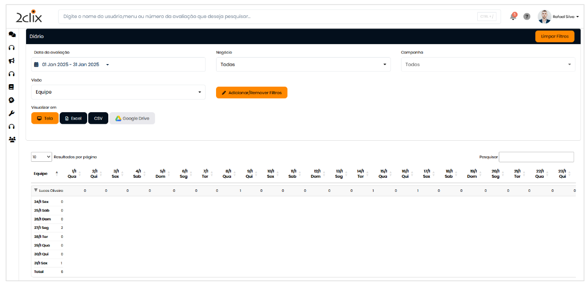O Relatório Diário é uma ferramenta essencial para acompanhar a produtividade das avaliações realizadas diariamente. Ele permite visualizar e analisar de forma detalhada as atividades, facilitando a identificação de padrões e oportunidades de melhoria.