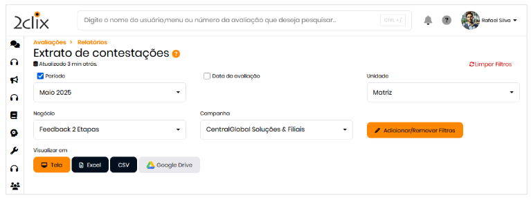 - Exportação: formatos disponíveis: Excel, CSV ou Google Drive.