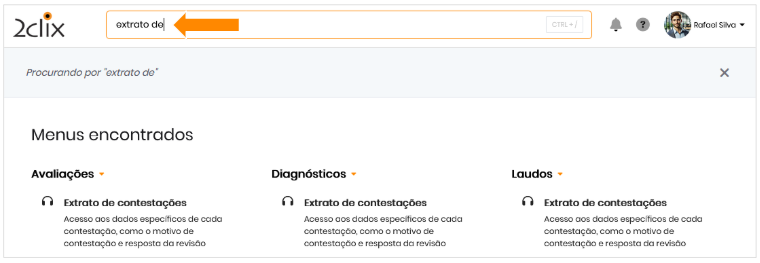 - Campo de busca: Pesquisar por Extrato de contestações e selecionar o resultado correspondente