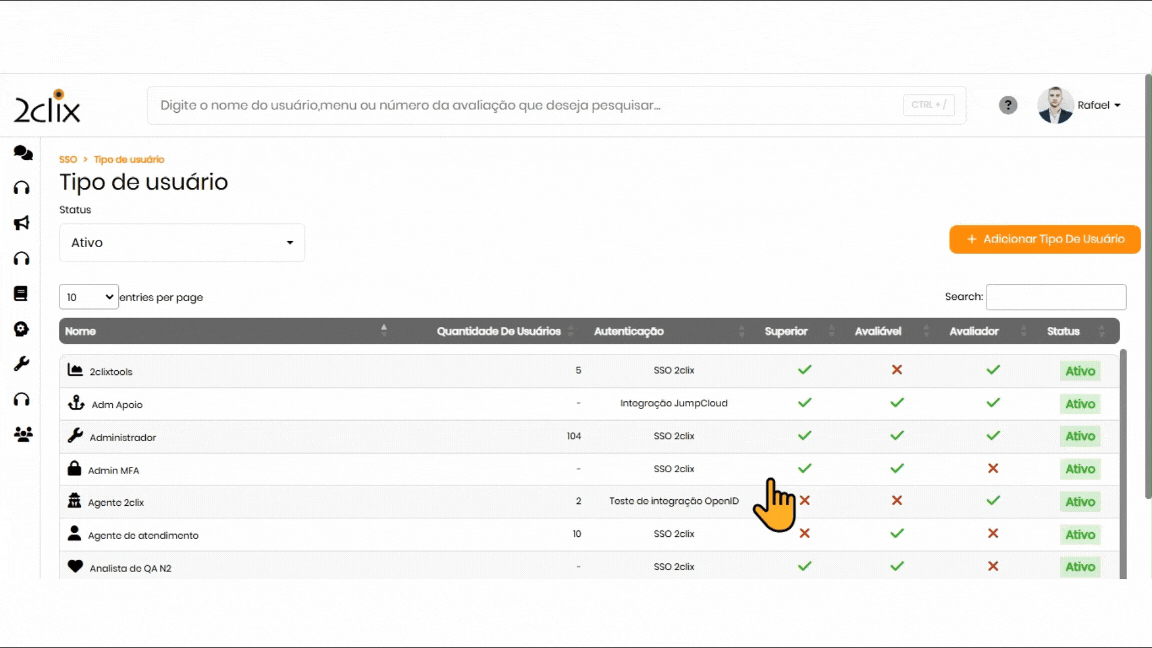 1. No menu lateral esquerdo, acesse: SSO > Cadastro > Tipo de Usuário .