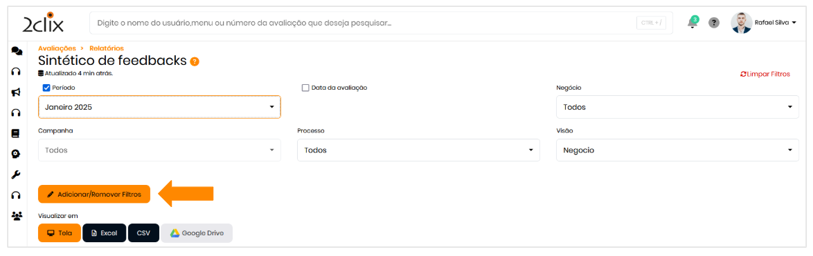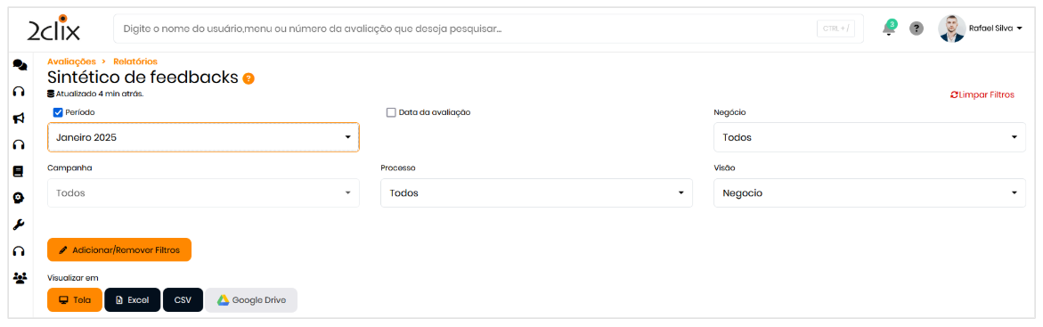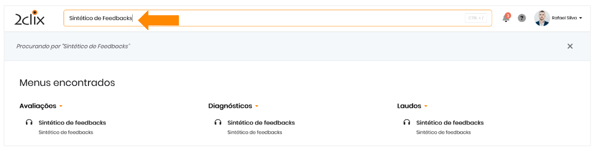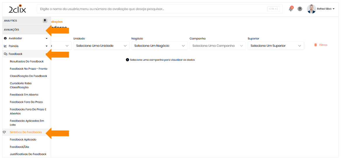 - No menu lateral esquerdo, acesse: Avaliações > Feedback > Sintético de Feedbacks.
