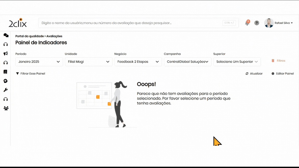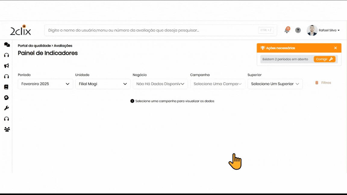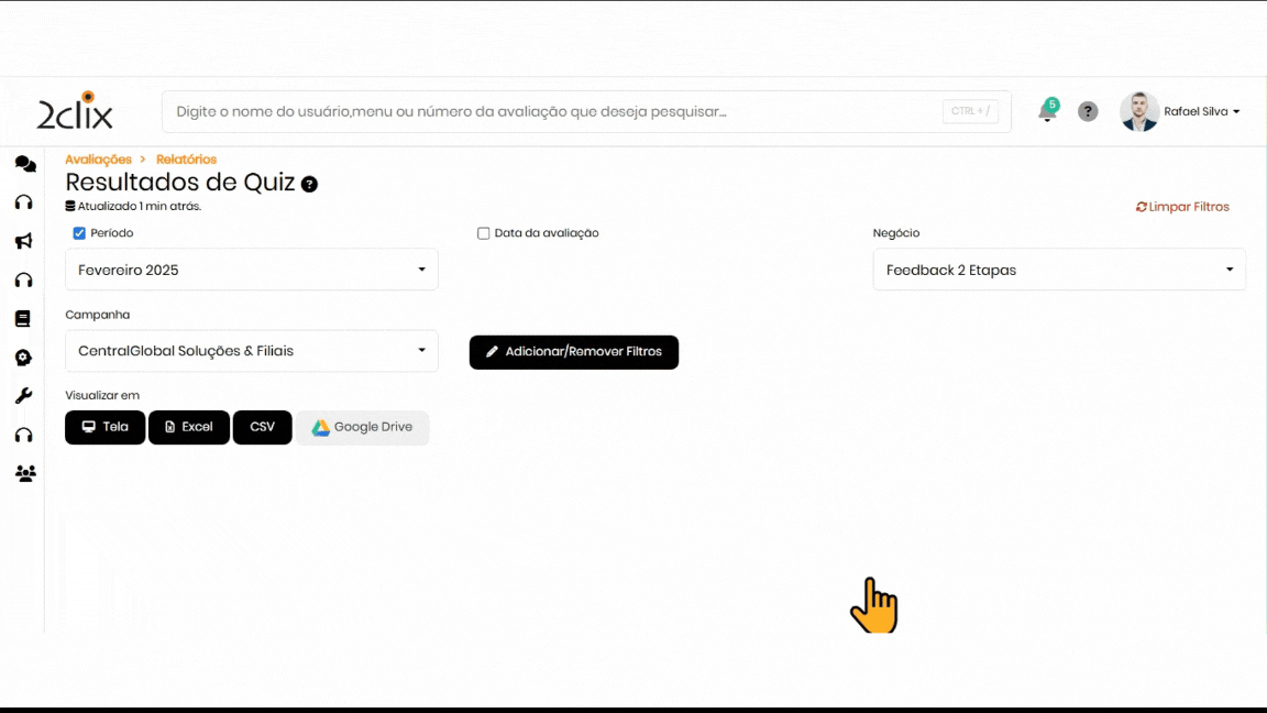 Ao acessar a página de relatórios, utilize os filtros disponíveis para localizar o questionário desejado. Após configurar os filtros, clique em Aplicar Filtros para atualizar a lista.