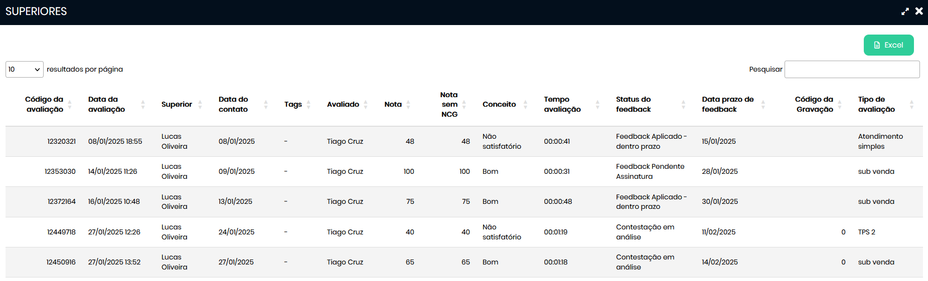 Ao clicar em uma linha do relatório, será aberta a visão detalhada do Superior, contendo: