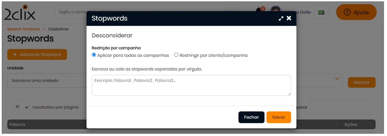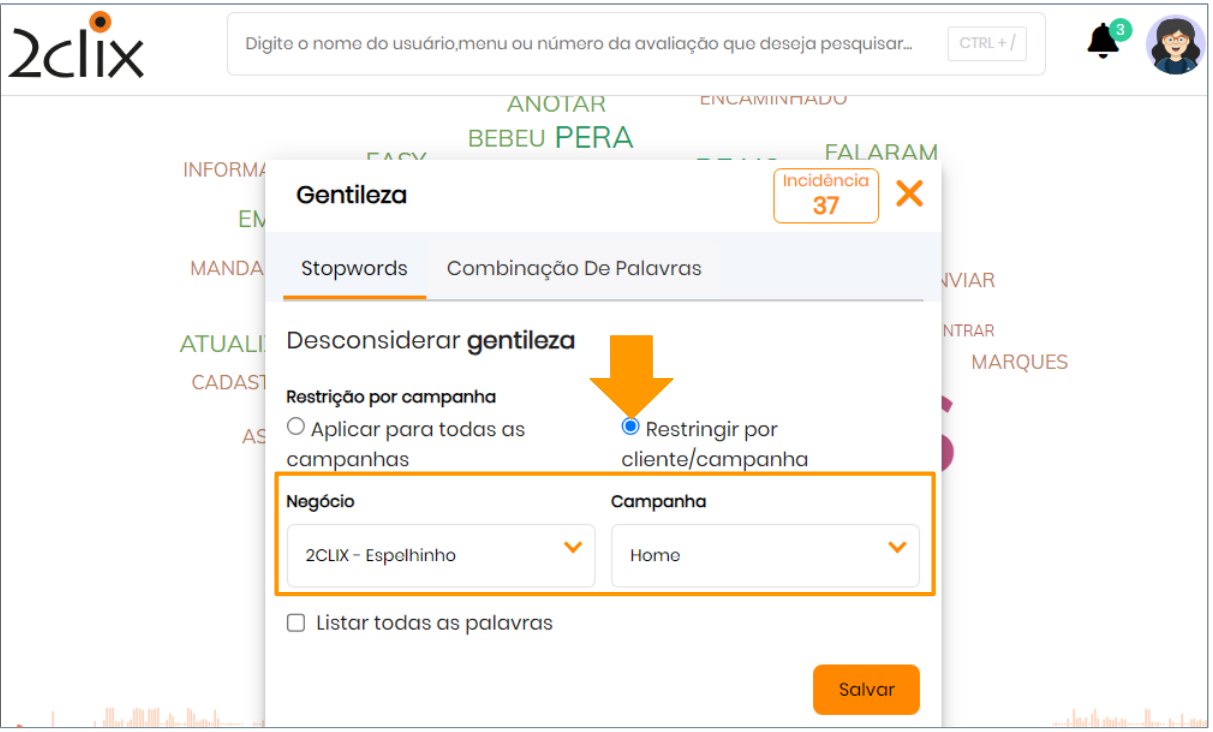 Clientes + Campanhas Específicos: a palavra será ignorada somente nas análises dos clientes e campanhas selecionados.