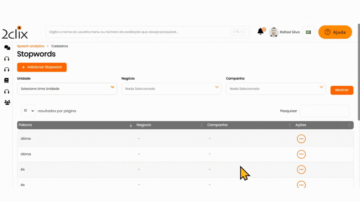 Para gerenciar suas StopWords, acesse o menu lateral esquerdo e selecione: Analytics > Administrador > StopWords.