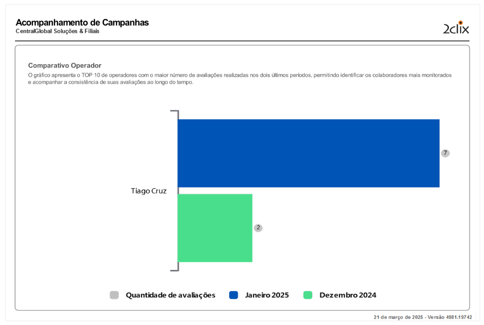 O gráfico de Comparativo de Operador apresenta o TOP 10 de operadores com maior número de avaliações nos dois últimos períodos. Essa visão facilita a identificação dos colaboradores mais monitorados e a consistência de suas avaliações ao longo do tempo.