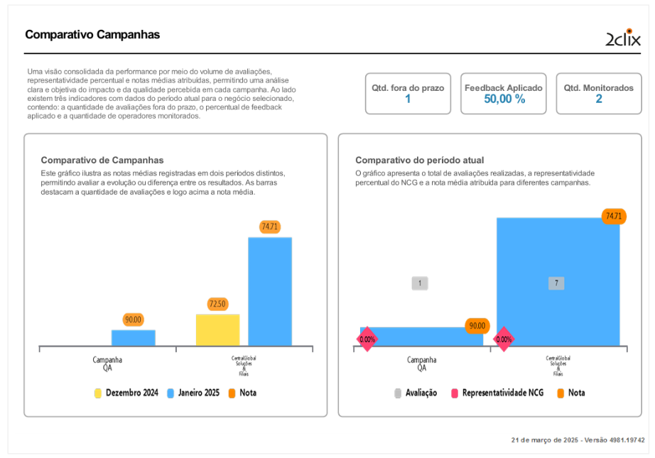 O comparativo de campanhas é representado por gráficos que ilustram as notas médias registradas em dois períodos distintos. Essa abordagem facilita a avaliação da evolução ou diferença nos resultados, permitindo a identificação de tendências de melhoria ou decréscimo no desempenho.