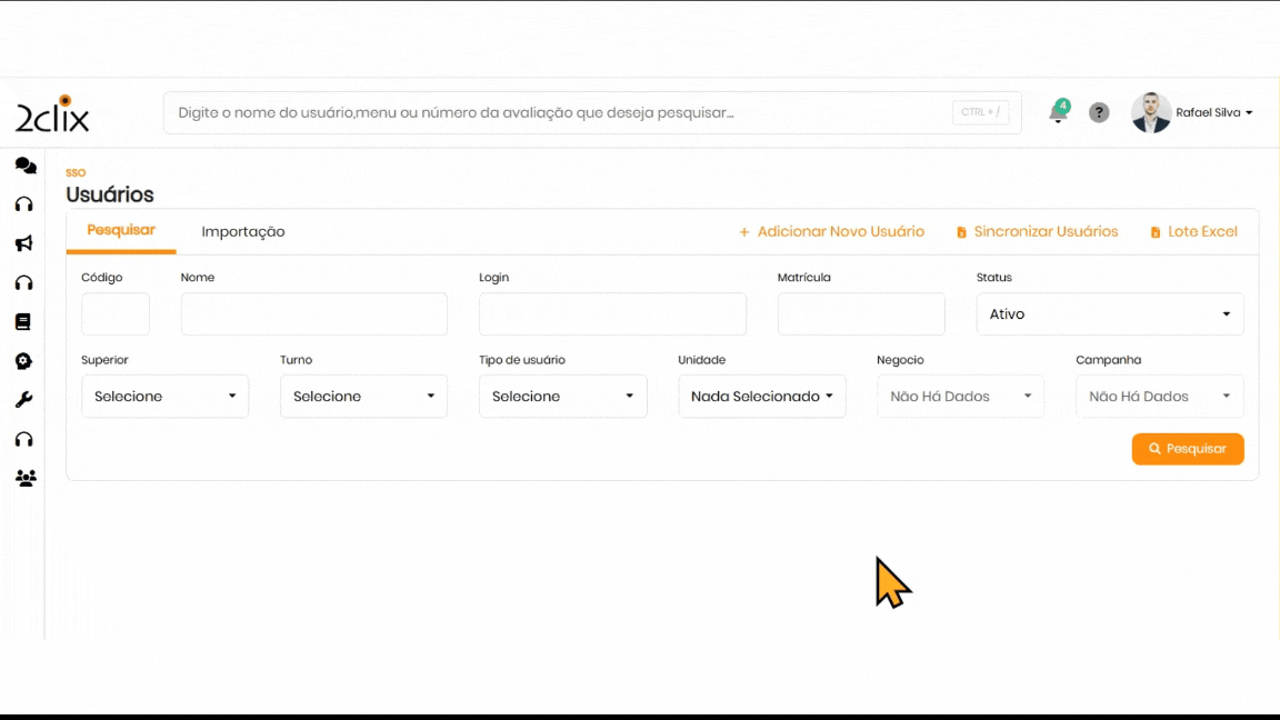 No menu lateral esquerdo, acesse: SSO > Cadastros > Usuários .