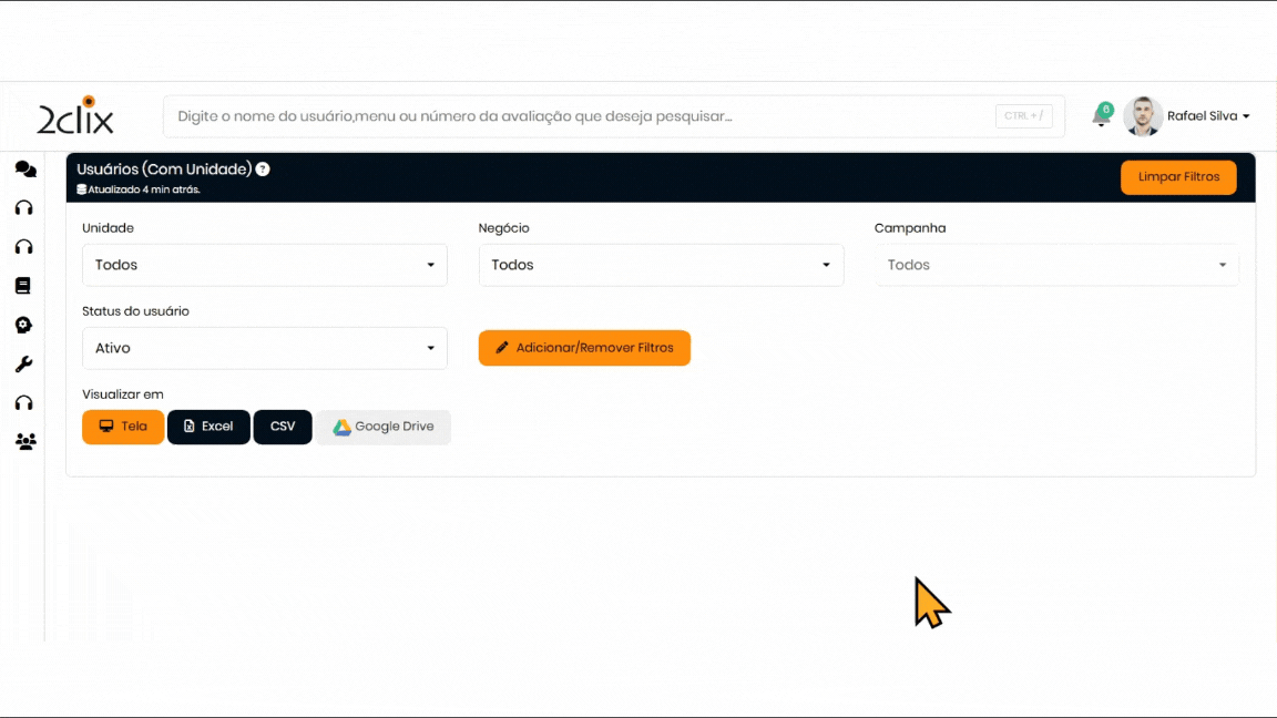 - Status: Status de utilização da plataforma (ex.: Ativo, Férias, Inativo, entre outros).