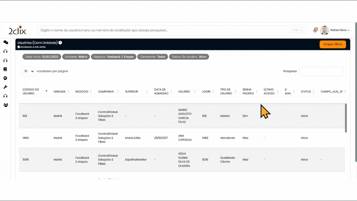 Na tela Usuários (Com Unidade), estarão disponíveis as seguintes informações:
